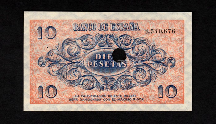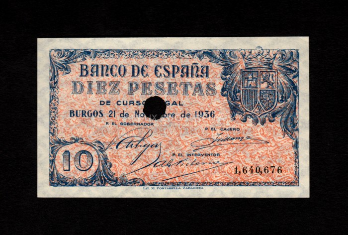 10 pesetas 1936, sin serie, S/C, taladro central de inutilización