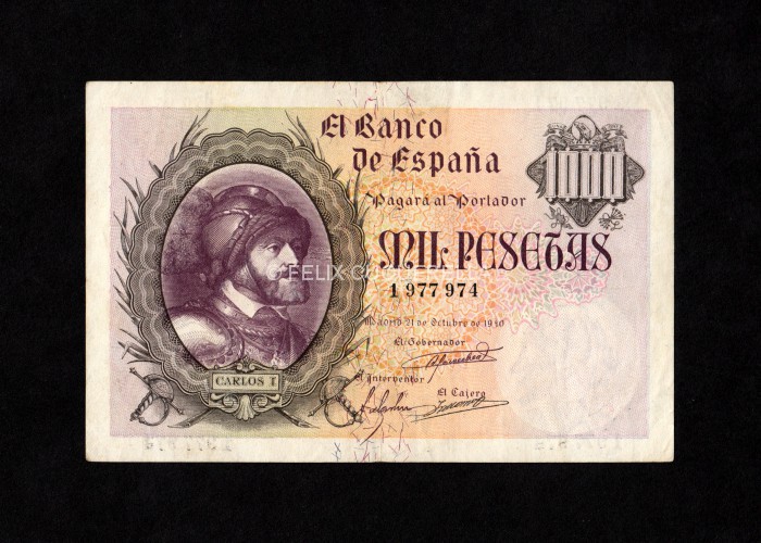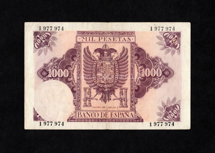 1000 pesetas Octubre 1940, sin serie, EBC-, pico doblado, 2 dobleces verticales