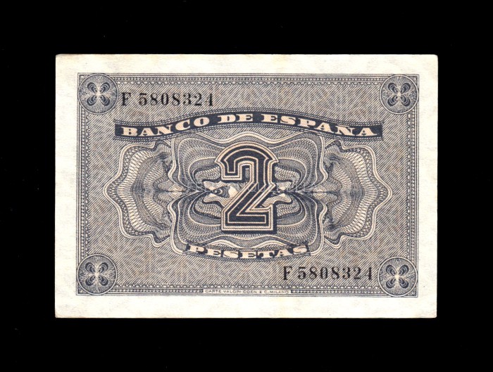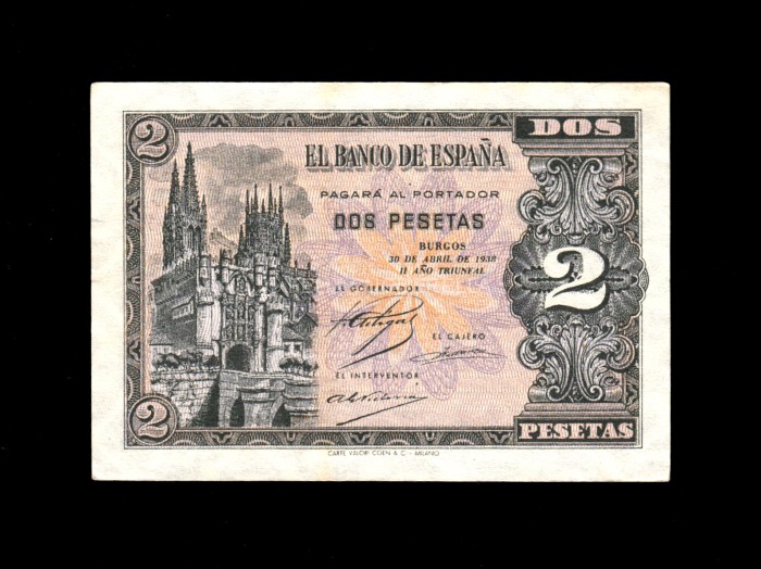 2 Pesetas abril 1938, serie F, S/C-, manchita en margen superior, arruguitas en laterales