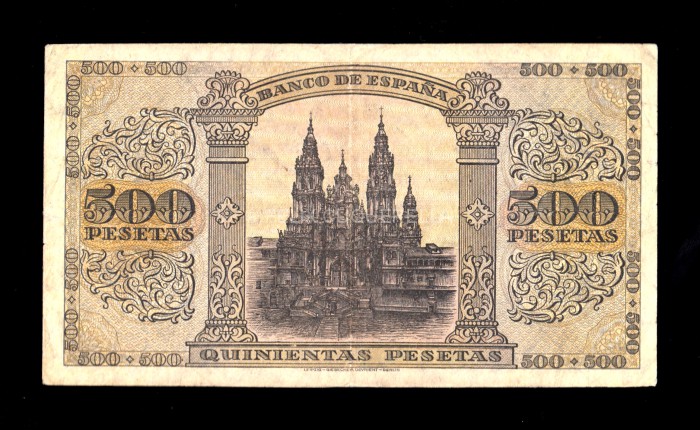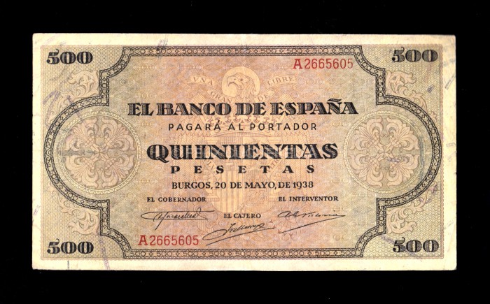500 Pesetas 1938, serie A, MBC+, reverso sucio, reparación en el centro del margen superior