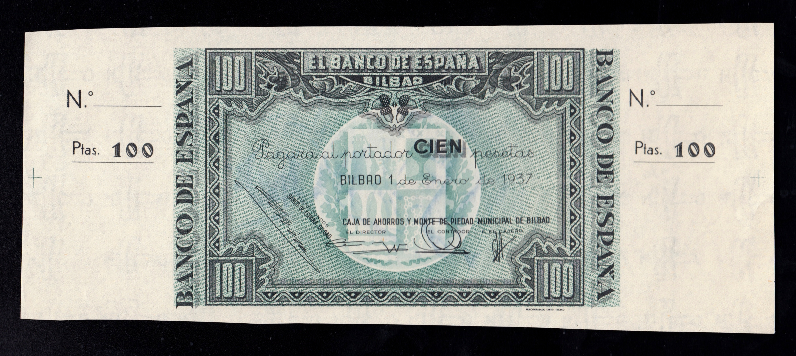 Banco de Bilbao , 100 Pesetas 1937 , S/C- , con matriz, Caja de Ahorros y Monte de Piedad Municipal de Bilbao