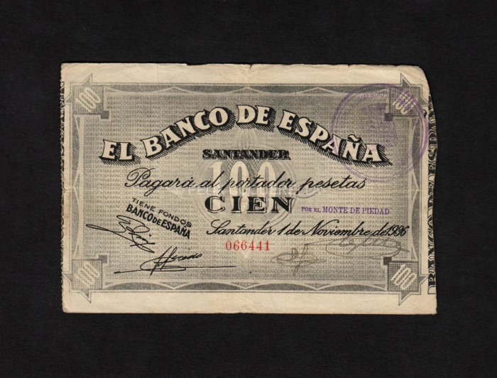Banco de Santander 1936, 100 pesetas, MBC-, sello de la delegación de Barcelona