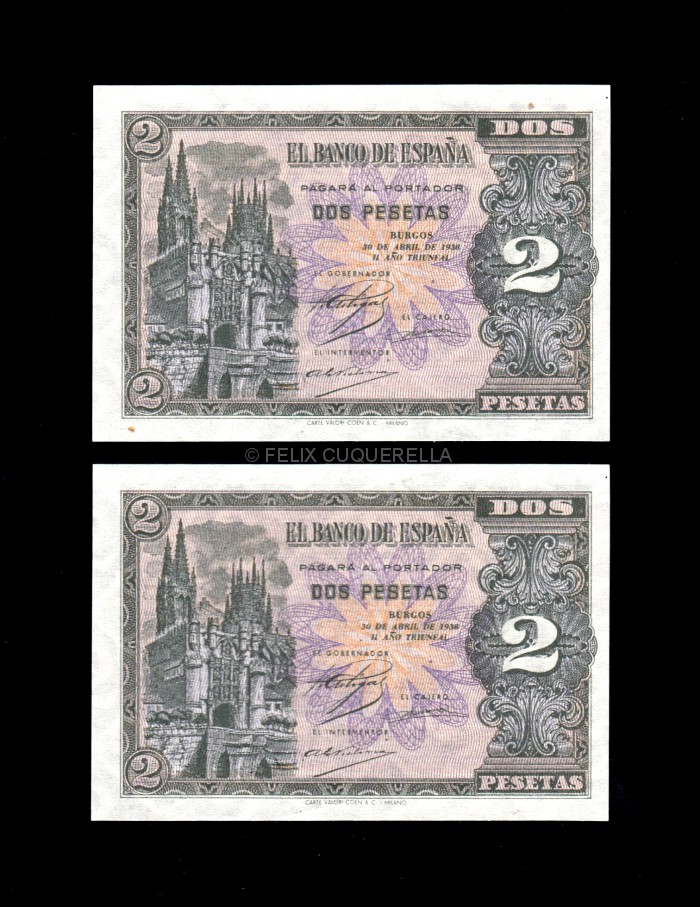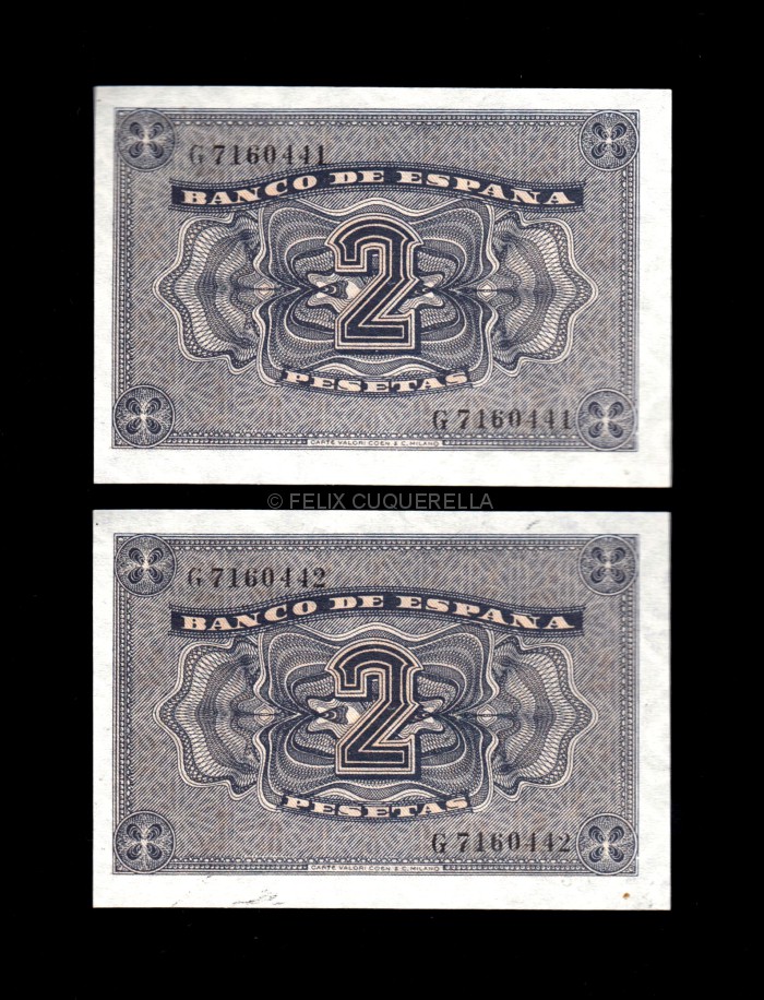 Pareja correlativa 2 Pesetas abril 1938, serie G, S/C-, manchita en el margen, un poco descentrada