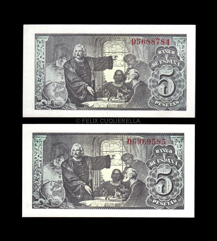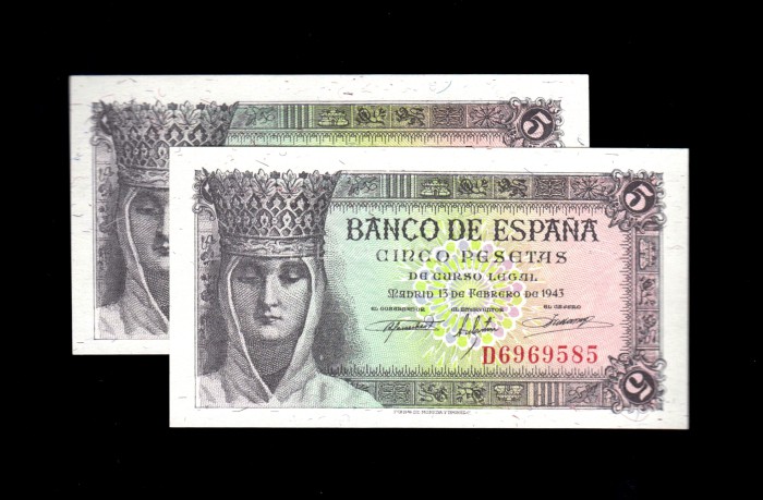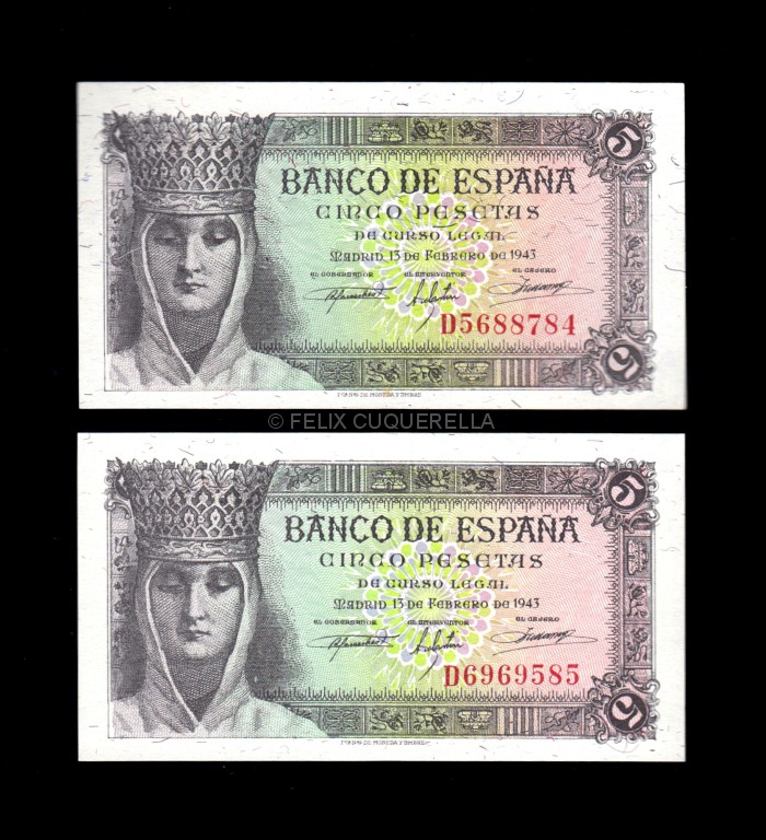 Pareja correlativa 5 pesetas 1943, serie D, S/C