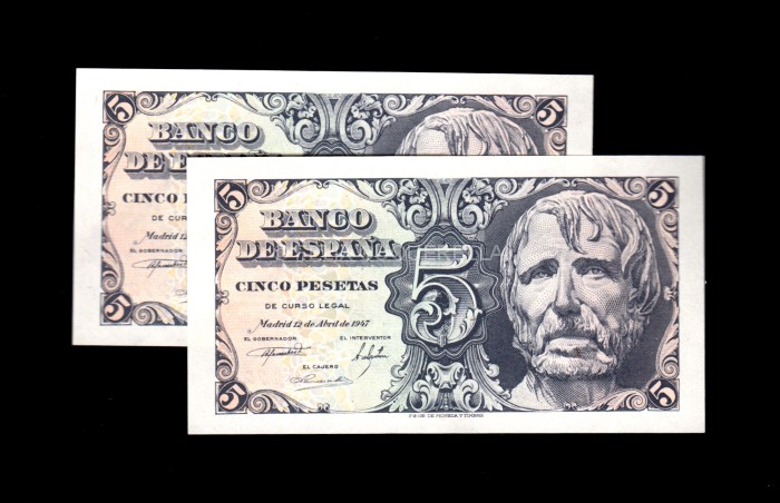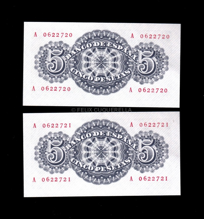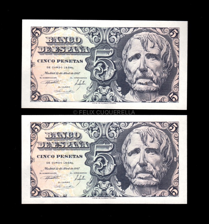 Pareja correlativa 5 pesetas 1947, serie A, S/C-, maltratados