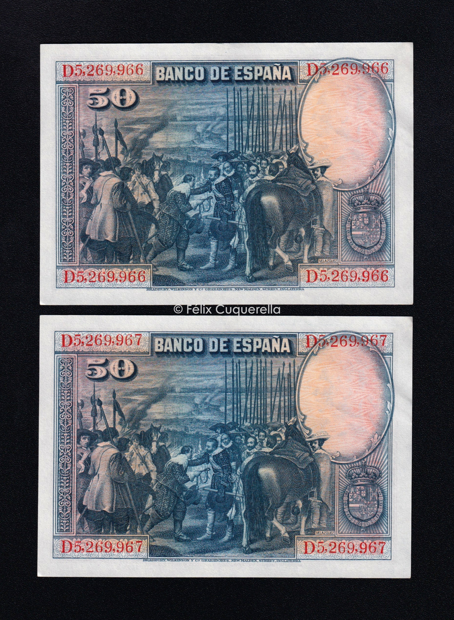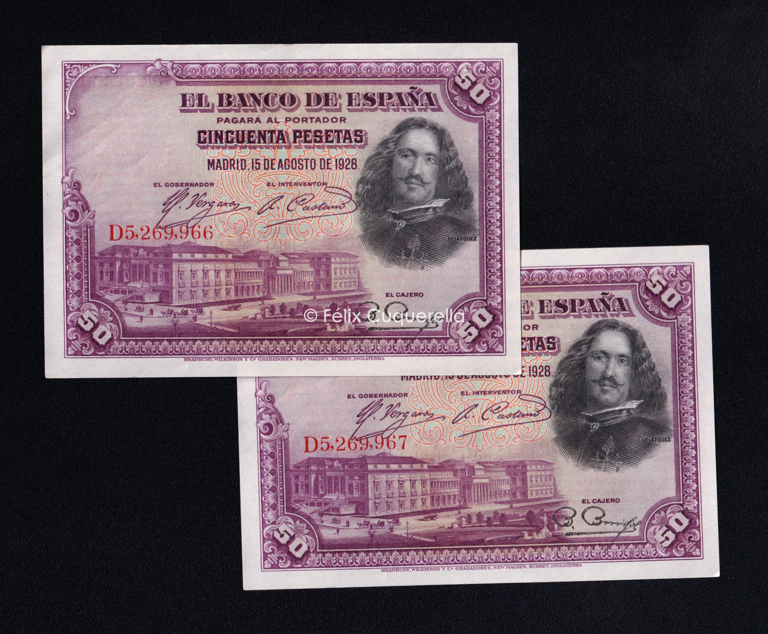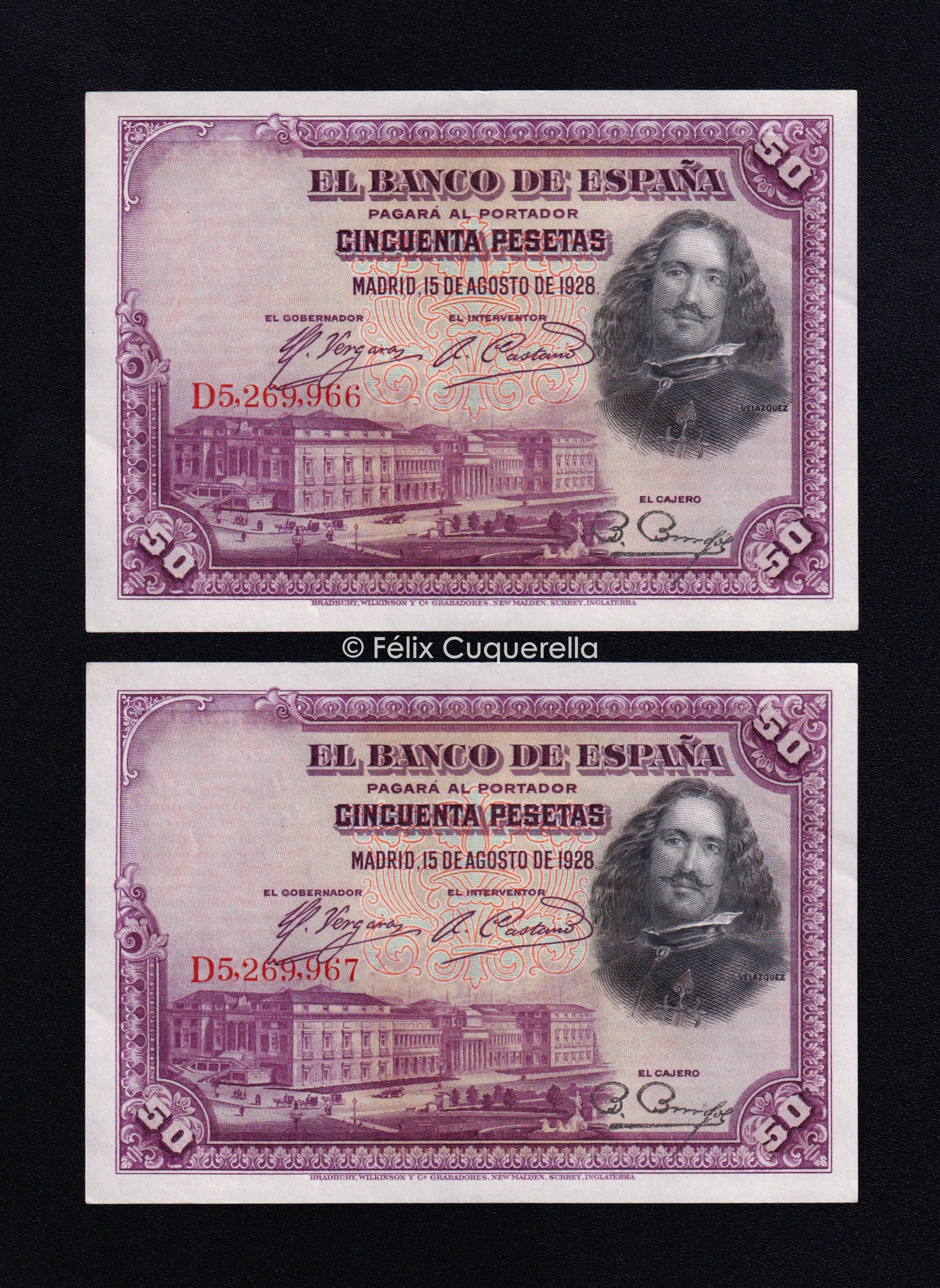 Pareja correlativa 50 pesetas 1928, serie D, S/C-