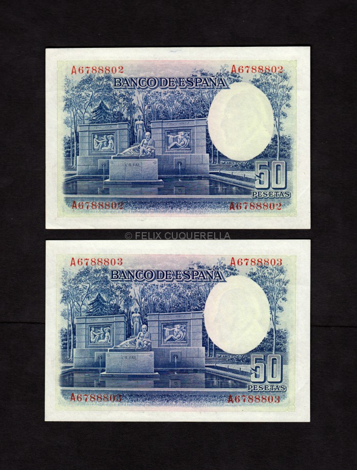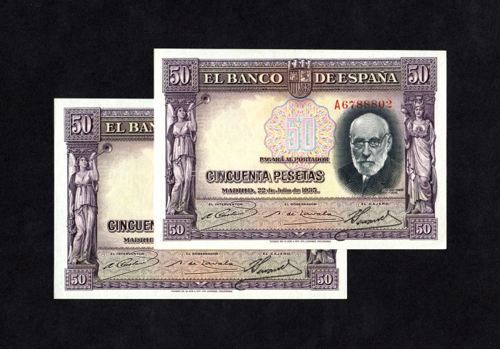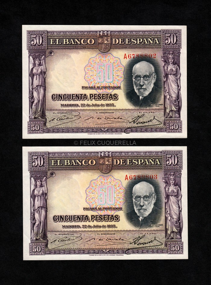 Pareja correlativa 50 pesetas 1935, serie A, S/C-, marquita en lateral