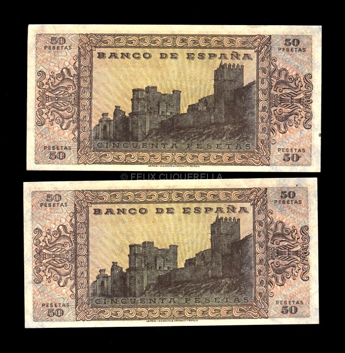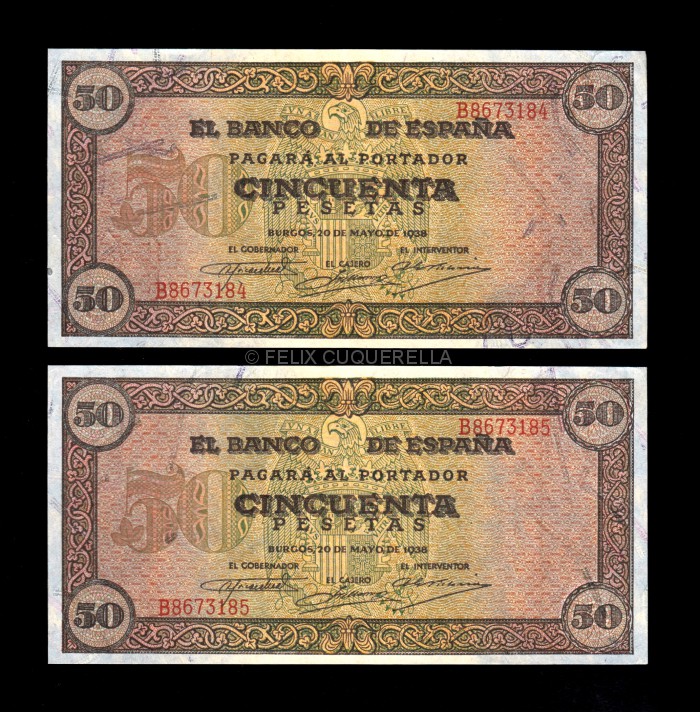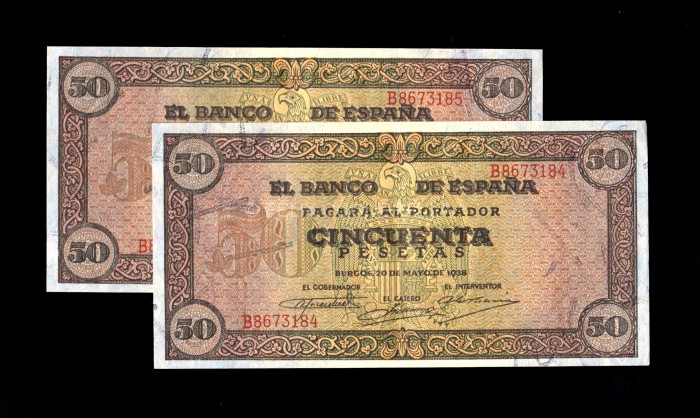 Pareja correlativa 50 pesetas 1938, serie B, EBC, con todo su apresto, sin romper la fibra del papel