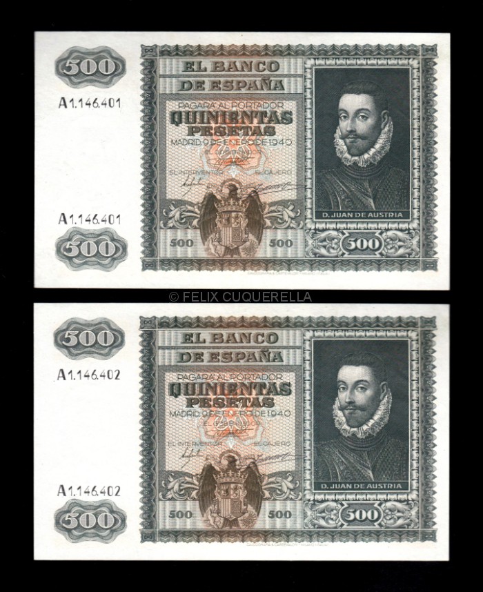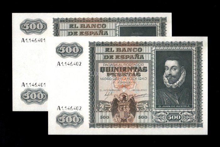 Pareja correlativa 500 Pesetas Enero 1940, serie A, EBC+, (1) pico doblado (2) marca en esquina